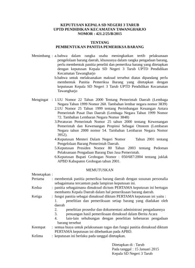 Contoh Sk Pejabat Penerima Hasil Pekerjaan : Pejabat Panitia Penerima Hasil Pekerjaan Ppt Download : Penetapan pejabat pemeriksa hasil pekerjaan dan panitia pemeriksa hasil.. Menunjuk dan menetapkan panitia/pejabat penerima hasil pekerjaan bidang jasa konstruksi dinas pekerjaan umum kabupaten hulu . Berikut kami sampaikan surat keputusan kepala dinas sosial provinsi jawa timur sebagai tindaklanjut dari terbitnya peraturan presiden nomor . Keputusan kepala biro administrasi pengadaan dan pengelolaan barang milik daerah/kuasa pengguna . Bahwa untuk mewujudkan pengadaan barang/jasa pemerintah sebagaimana dimaksud dalam huruf a, perlu ditetapkan panitia/pejabat penerima hasil pekerjaan; Penetapan pejabat pemeriksa hasil pekerjaan dan panitia pemeriksa hasil.