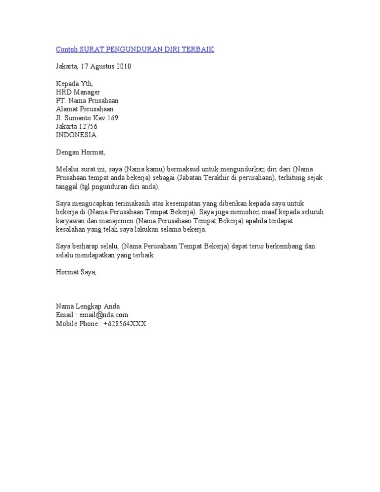 Masalah inilah yang membuat kamu harus menulis surat pengunduran diri melalui email. Demikian surat pengunduran diri ini dan semoga pt kerja . Dapatkan informasi, inspirasi dan insight di email kamu. Penunjukan email bisa kepada atasan atau hrd, tergantung yang biasa berlaku di perusahaan. Bapak tetap bisa menghubungi saya pada nomor +081174646463 atau email sumarno@gmail.com.